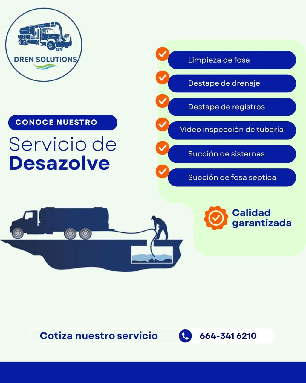 Destapado de drenajes y limpieza de fosas ofrece servicios profesionales de limpieza de fosas en Tijuana, con más de 25 años de experiencia brindando soluciones rápidas, seguras y garantizadas en el mantenimiento y saneamiento de sistemas sépticos, drenajes y redes pluviales. Atendemos en Tijuana, Rosarito y Tecate, ofreciendo precios competitivos y cotizaciones sin costo, adaptadas a cada tipo de trabajo.